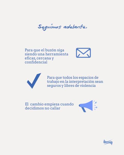 Desde la Unión, nuestro compromiso continúa. Seguimos trabajando para que el buzón siga siendo una herramienta eficaz, cercana y confidencial, para que todos los espacios de trabajo en la interpretación sean seguros y libres de violencia. Porque el cambio empieza cuando decidimos no callar, con la seguridad de que la Unión permanece a vuestro lado para acompañaros en el camino.