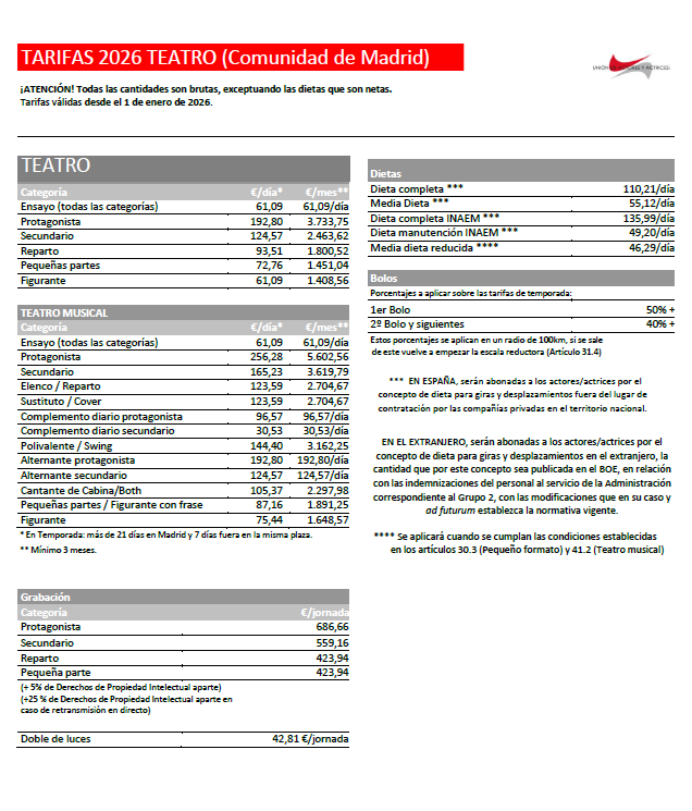 - VI Convenio de Teatro (Comunidad de Madrid), establece condiciones laborales y salariales de actores y actrices en la Comunidad de Madrid. En vigor desde el 6 de junio del 2015.